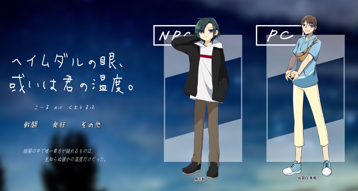 ●同じ内容をふせったーにも投稿してます(コメントがある場合はそちらがいいかもしれません) リザルト(218)PL(167)GM(53) メモやふせ(741)絵(36)CoC(963)エモクロア(13) (ハッシュタグを選択) 海も枯れるまで (57) 四季送り (48) 異能警察は、英雄じゃない (46) 六畳半の夏 (40) 烏が群れては、極彩色 (37) 快刀乱魔 (35) NOBODY*2 (33) 庭師は何を口遊む (33) 拝啓、贖イ郵便局の皆様へ (27) ドロップアウトディスパイア (24) アイラスの双眼 (23) VOID (22) 遺香廻り (22) 爛爛 (20) X2U-バイガスライト- (18) 東京ゴーストマティカ (18) THESEUS (18) 片鱗 (14) ラプラスのクォーター達 (13) End&Duo (13) かいぶつたちとマホラカルト (12) ビスポークランドでなにがあったか? (10) 魔が時に鵺の鳴く (10) Code; GABRIEL (9) サイレン清掃会社 (9) FRaTRICiDE (9) ぎこちない同居 (9) キルキルイキル (9) 狂気山脈 (9) リバースリバースリバース (8) Paranormal Crime (8) 海渡のクリュティエ (8) 辜月のN (8) My dear,“H” (7) Hat Hat Hat... (7) ステガノグラフィ (7) 誰がロックを殺すのか (7) 変葬 (7) そこはお前の墓場じゃない (6) コードネーム:ドッペルゲンガー (6) 夢の音楽家 (6) サイテイギの水槽 (6) 地獄の沙汰をも飲み込んで (6) 若鷲の双眸 (6) デウス・エクス・マキナは死んだ (6) 客星×覚醒 (6) 海からの声 (6) ソープスクール (6) 空中ブランコ乗りのエリー (6) 輾転と町は (5) ヌレガラス (5) 美術館ホラーRTA (5) カノヨ街 (5) 吠日怪界 (5) 悪魔の唇 (5) カタシロ (5) 八月の硝子の森 (5) ユーデストピア (5) 輸送箱 (5) デュエットレイス (4) 快刀乱魔学園 (4) 事象地平のアストロナウト (4) REGICiDE (4) 夏に至る病 (4) シキラレ■■ (4) 刹夏 (4) 奇魔真名魑魅魍魎 (4) ゆらめく魔法市 (4) Midnight pool (4) 燐光の夜間学級 (4) STROBE (4) 墜星グランディオーソ (3) Mua (3) ◆ヤナPCメモ (3) 奇妙な動物園 (3) 一場の春夢 (3) 灰とアカツキ (3) ハイフェッツをなぞる病 (3) 月夜に蠢くルーガルー (3) クトベント (3) ようこそ!迷冥市役所都市伝説課へ! (3) 君待つ明日に僕はいない (3) Call the Name of Your Fat... (3) 水槽回顧 (3) のみくらべNIGHT (3) 魔法亡き世界 (3) 人生画廊 (3) 東京ヴィラニカデビル (2) 暑と寒 (2) ドロップアンドヴァンパイア (2) DL : Halloweneir (2) The Hog Game (2) AND/HAND (2) 怪異交渉人 (2) ロールシャッハシンドローム (2) Escapeghost〜7匹の仔山羊からの脱出〜 (2) 心臓がちょっとはやく動くだけ (2) 午前2時の酔夢 (2) 傍若無人 (2) エンド・オブ・ジャーニー (2) Want to be born (2) ゴースト×刑事 (2) 君の薫りを僕に書かせて (2) キブンゼ (2) 蹂躙するは我が手にて (2) ネバーランド・クラブ (2) 白紙のアリスをさがして (2) N川殺人事件 (2) 四畳半のアクアリウム (2) 星の神話、エンドロール (2) 空白の航海 (2) 毒入りスープ (2) ラストグラス (2) Schadenfreude Euphoria (2) フカシカ▲▲▲ (2) インパーフィクション・ワンダーランド (2) 蝉・Final way (2) 相棒は名”犬”探偵 (2) もふもふひつじさん (2) ねこの小道 (2) レモナード・カンパニー (2) 君のためのヒポクリシー (1) To nirvana (1) 落掌ランデヴー (1) 獄獄 (1) 銀蠟と怪盗団 (1) ひときれの無垢 (1) サムシングフォーを探して (1) 少女Aの証明 (1) Escape from MOTHER-SHIP (1) VIVID VISIBLE (1) 実録!バニー警察24時 (1) しきじき (1) RECOVERY GAME BOX (1) ひとりべや (1) 対等ベルトパニック (1) 君の皮膚を泳ぐ (1) バックスペース禁止シナリオ (1) ド〜プ・アップ・チリ〜 (1) 亡心の花導 (1) ONE SHOT! (1) 気づいたらしんでた (1) あいつ何処にいった!?2 (1) お、捨てKPCだ。可哀想に… (1) ねべでむ (1) ごぜんにじにあいにきて。 (1) 縁紡園 (1) そうだ、キョウトとやらへ行こう。 (1) 変転されしモルフェ (1) タソガレ駅前夏雪堂九畳半神話 (1) 今日はさくさくルースのクッキーを作ります! (1) 雲雀と水仙 (1) 恐怖の最悪デスチョコレート (1) 別にアンタのことなんか好きじゃないんだからね! (1) まんだらかばら (1) Poison pancake (1) クラゲの水槽でさようなら (1) 獄夜を歩くぼくら (1) お前は!ハムスターになるんだ! (1) 家の中を歩いてみよう (1) 腐乱腐乱 (1) 508-高架下トンネル (1) 腹が立ったら殴ればいい! (1) 箱庭で鎖を鳴らしたら (1) 塔葬の国 (1) In limbo (1) 母なる海の鯨の部屋 (1) 渚に届くラブレター (1) She Wore a Yellow Ribbon (1) ポイエシスの墓守 (1) WANNABE (1) 狐惑的なあなた (1) 雨降る君の淡い嘘 (1) 空に沈むシータス (1) 海に昇るファーシール (1) ヘイムダルの眼、或いは君の温度。 (1) for Room (1) キキツヅニナク (1) セイント・ナイト・ギフト (1) 0からの飛距離 (1) 清夏、朝へ返れ。 (1) Dancing TINTIN (1) 水槽病棟 (1) ショットガン目星 (1) ロッカー (1) 壁の中にいる (1) カテゴリ「PL」に属する投稿[167件](13ページ目) CoC #星の神話、エンドロール KP:きのこ PL / PC: じろ / ロビン・メイヤー ヒスヤナ / 春樋 晶 こうた / 橘 海史 76文字, 2022.07.02 20:39 favorite リザルトPLCoC CoC #空に沈むシータス #海に昇るファーシール HO 鯨:きのこ / 御篠 和保 HO 犬:ヒスヤナ / 御篠 佑久 66文字, 2022.06.26 20:34 favorite リザルトPLGMCoC CoC #ヘイムダルの眼、或いは君の温度。 KP / KPC:そうは / 南 千彰 PL / PC:ヒスヤナ / 佐賀白 美和 エンド