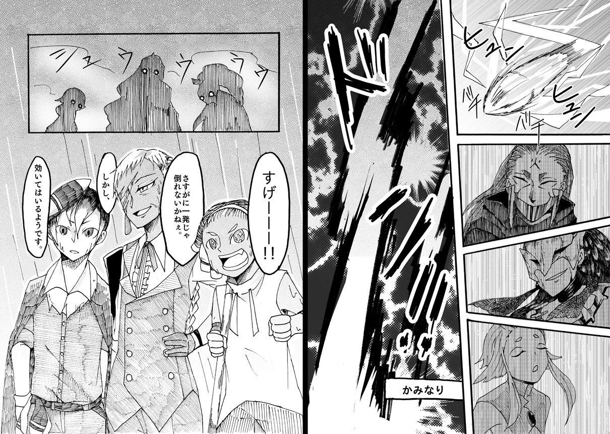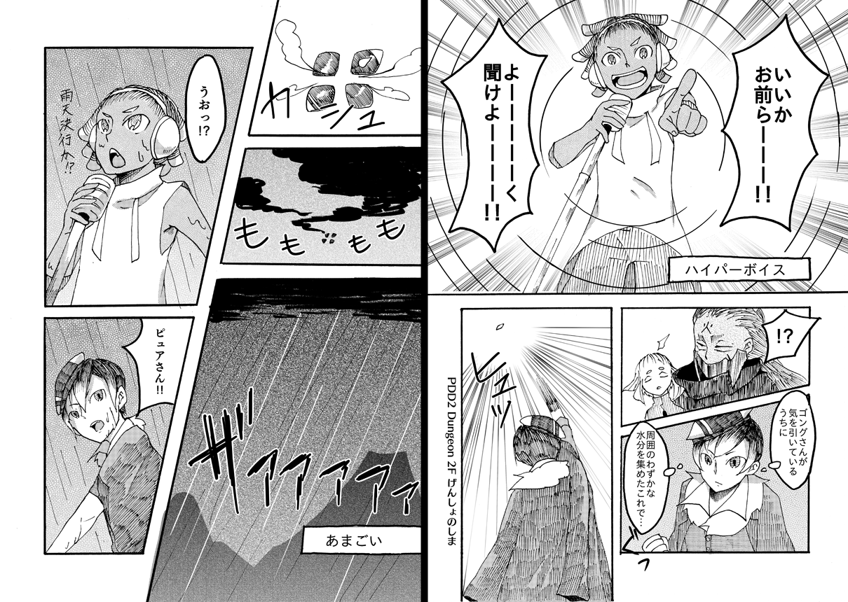 ゴングくんのハイパーボイスで気を引く→トイツェルカのあまごい→ピュアさんのかみなり、という連携で攻撃!